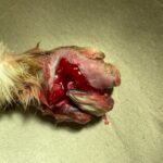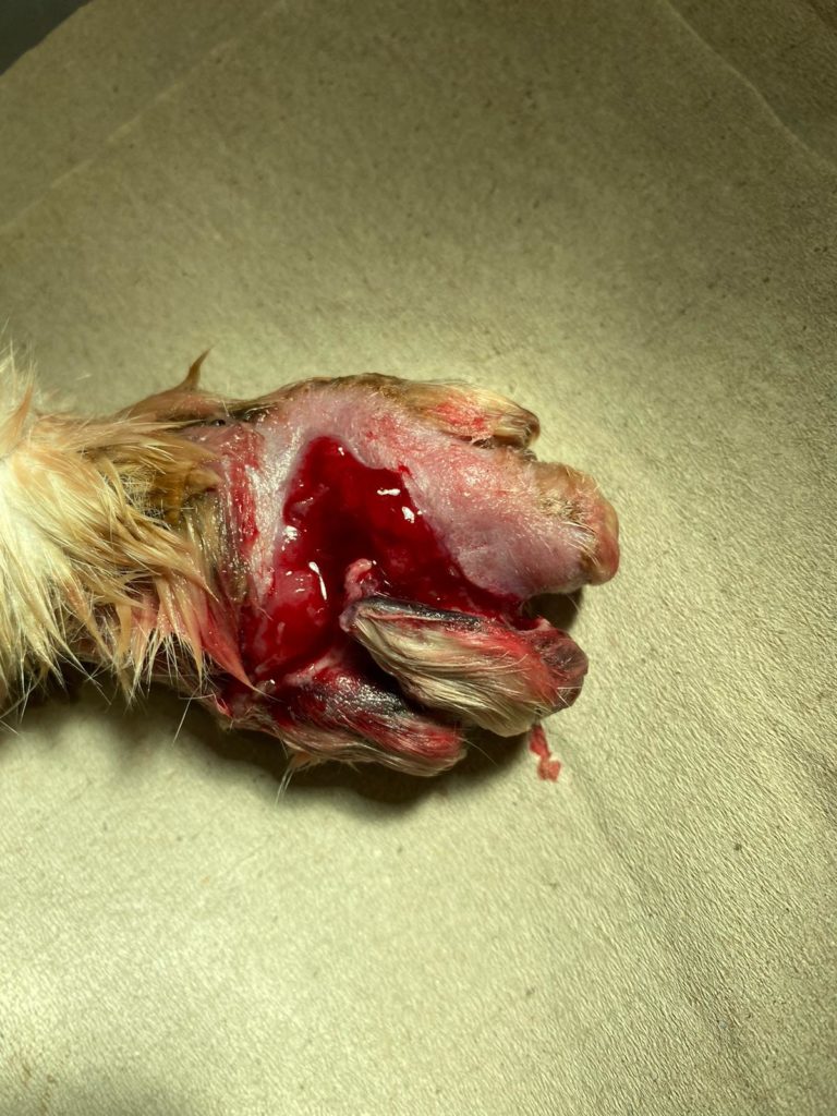 Samstag in der Früh stellte Markus fest, das der kleine sich in einer Falle verfangen hat und seine Pfote schwer verletzt war. Markus und Barbara fuhren sofort zum Tierarzt, der ihnen leider nicht helfen konnte, außer dem kleinen Tabletten für die Schmerzen und Amoxicillin-Antibiotika mitzugeben. Wir fuhren vor Ort und jeder, der sich die Pfote ansieht, weiß normal, dass diese sofort behandelt gehört hätte. Also packten wir den kleinen ein und fuhren zum TA für die Wundversorgung. Wir hoffen, es ist nicht zu spät… Nun darf der kleine Kerl in Obhut genesen und wir hoffen, das seine Pfote nicht doch noch amputiert werden muss… In einer Woche entscheiden wir erneut für ihn…..jetzt erst mal gute Besserung kleiner Mann.